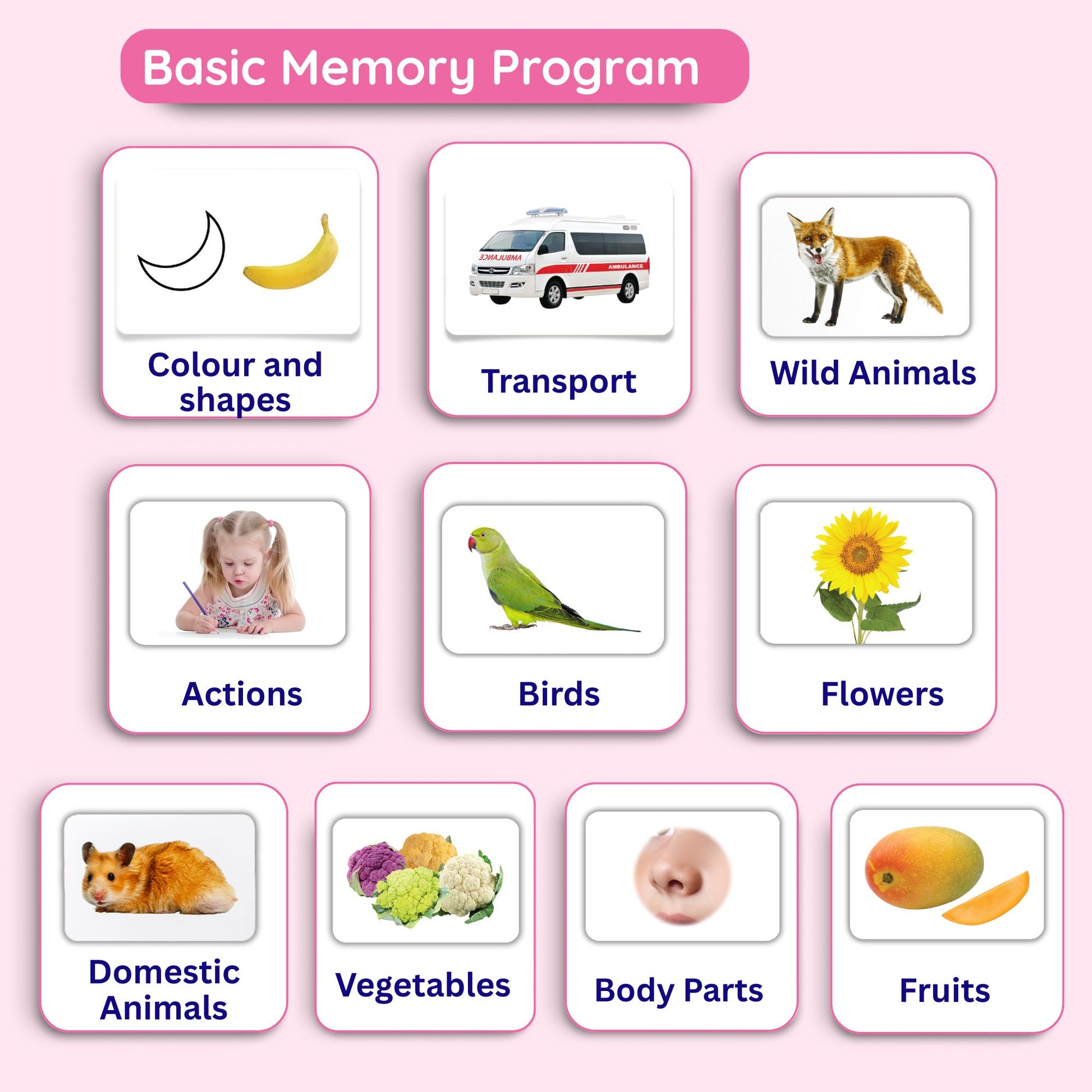 Make your learning fun with flashcards for toddlers. Each topic has 24 Flashcards covering all the major names of Fruits, Vegetables, Body parts, Actions, Domestic Animals, Wild Animals, Transport, Birds, Flowers, Colours and shapes. Find out the best type of Flashcards for Infants for 3 months to 6 years. Flash cards develop the love of learning in a fun and playful manner